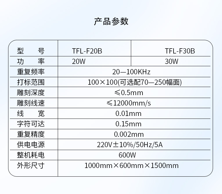 通發(fā)激光研發(fā)的TFL-F20B激光打標(biāo)機(jī),金屬材質(zhì)和塑膠材質(zhì)均可進(jìn)行打標(biāo)加工。本激光鐳雕機(jī)光纖激光器、振鏡、軟件、聚焦鏡等核心配件采用原裝進(jìn)口,性能穩(wěn)定,壽命是國(guó)產(chǎn)器件的1.5倍,是高端客戶的優(yōu)選。