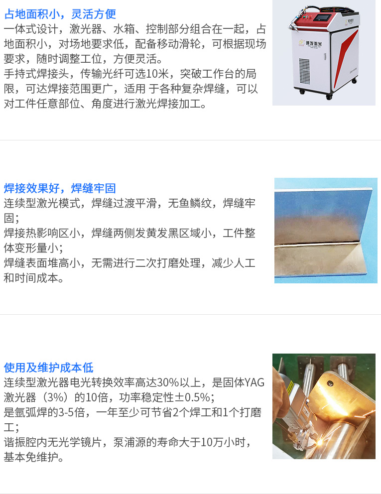 通發(fā)激光一體式手持式激光焊接機,用手持式焊接槍替代以前固定光路,手拿焊接,靈活方便,焊接距離更長,克服工作臺空間的局限性,工件尺寸不統(tǒng)一時無法自動焊接的情況下使用。主要針對大型工件、固定位置如內(nèi)直角、外直角、平面焊縫焊接、焊接時熱影響區(qū)域小,變形小、而且焊接深度大,焊接牢固。是遠距離焊接大工件的較為靈活的全新的焊接工藝。