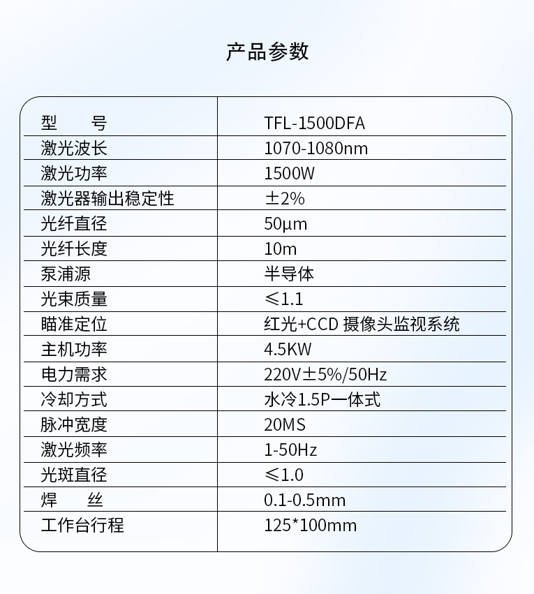 采用光纖激光器,反射率高,能量強,免維護,免調(diào)光,功耗少,相比傳統(tǒng) 模具焊來說,安全,穩(wěn)定性好超長使用壽命。 1500W光纖激光器,滿足銅、鋁焊接量大的模具及產(chǎn)品焊接加工需要。 高承重底座及工作臺,保持輕便靈活的優(yōu)點,同時提供更高承載能力。 配備.1.5P大功率一體式水冷水機,保證了大功率焊接的穩(wěn)定性。